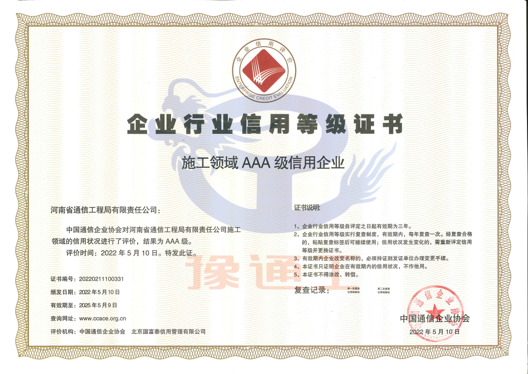 通信施工領(lǐng)域信用企業(yè)AAA級(jí)